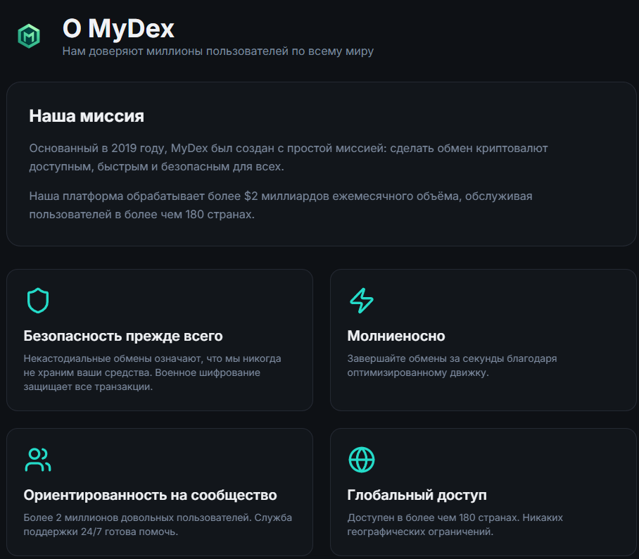 MyDex – это криптовалютный обменник, якобы созданный в 2019 году. Основатели обещают, что их сервис работает без перебоев практически во всех странах и позволяет мгновенно конвертировать и переводить токены. Очевидно, подобные заявления нуждаются в проверке, тем более в интернете о проекте почти ничего нет. Далее в материале расскажем, можно ли безопасно проводить здесь сделки или нет.