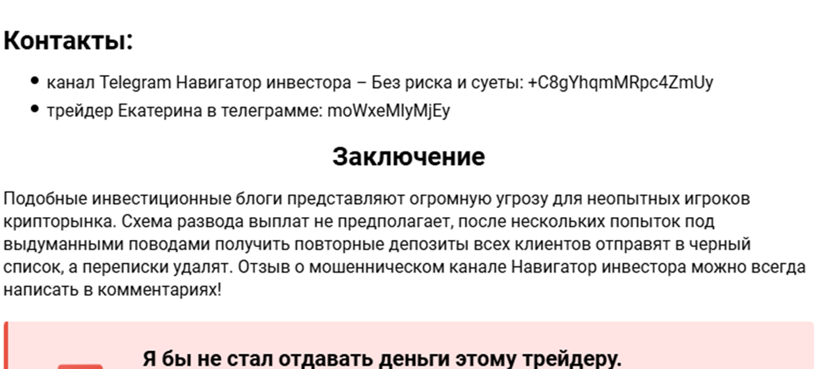 Проект «Навигатор инвестора» закрыт и больше не привлекает инвесторов. Хотя нет гарантий, что Екатерина не начнет свою деятельность под другим именем на новом аккаунте. Чтобы обезопасить себя от мошенников, всегда проверяйте наличие документов, статистику, подтверждающую реальность сделок трейдера, изучайте отзывы и тематические сайты. Типичным признаком скамеров является накрутка в телеграм-канале и закрытые комментарии.