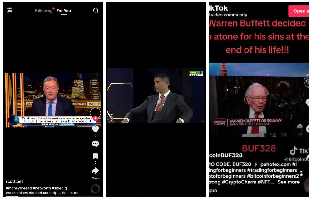 На сайт площадки привлекали преимущественно через социальные сети. Одной из любимых платформ мошенников была платформа ТикТок. На ней размещали сгенерированные видео, в которых участвовали звезды, якобы причастные к работе сервиса. Вот пример нескольких таких видео: