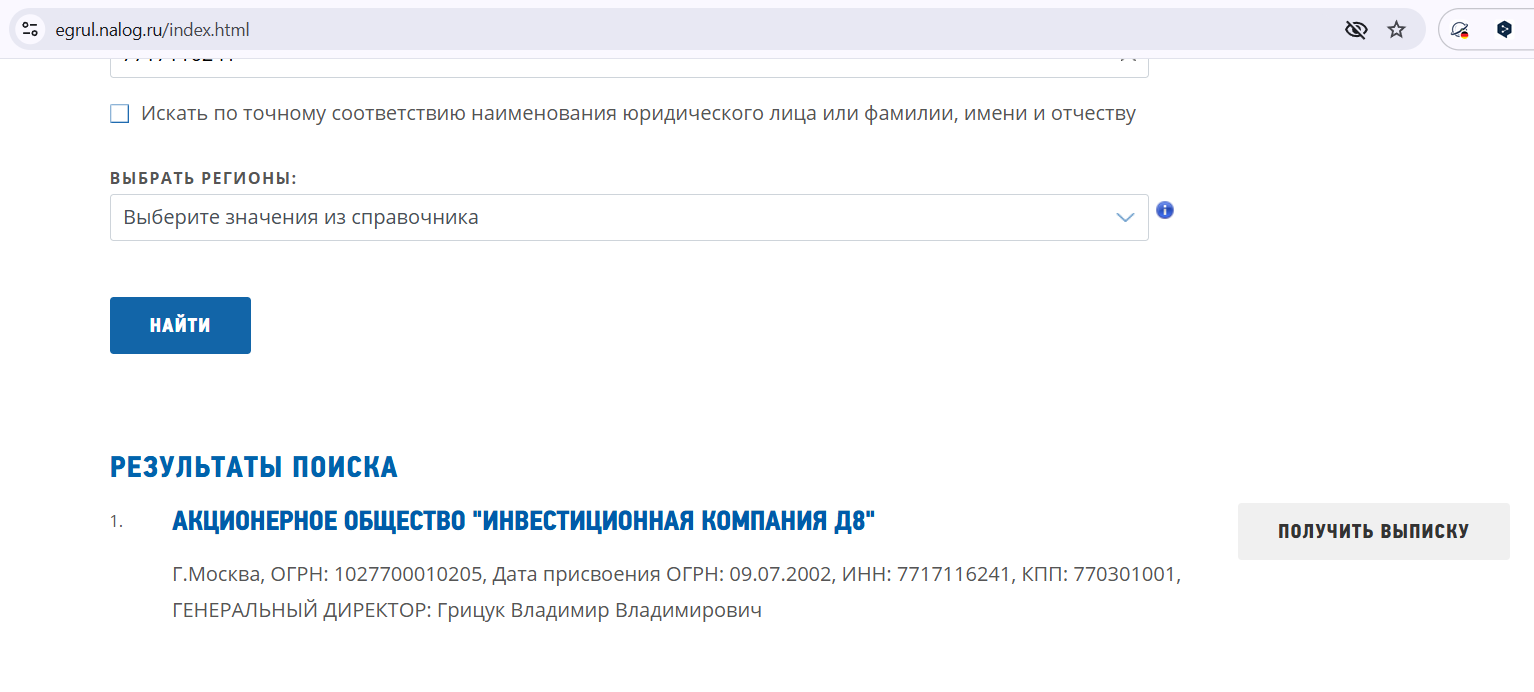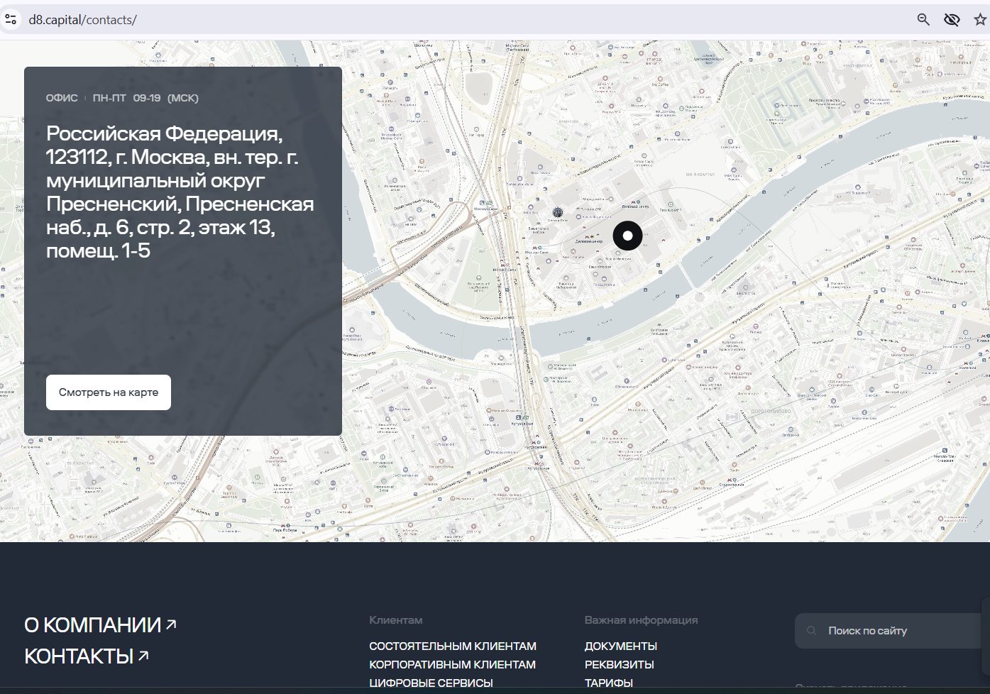В нижней части сайта указаны контакты с наименованием организации и реквизитами. Простая проверка адреса показывает, что по нему находится совсем другая инвестиционная компания D8. Проверка ИНН подтверждает, что по номеру зарегистрировано одноименное акционерное общество.
