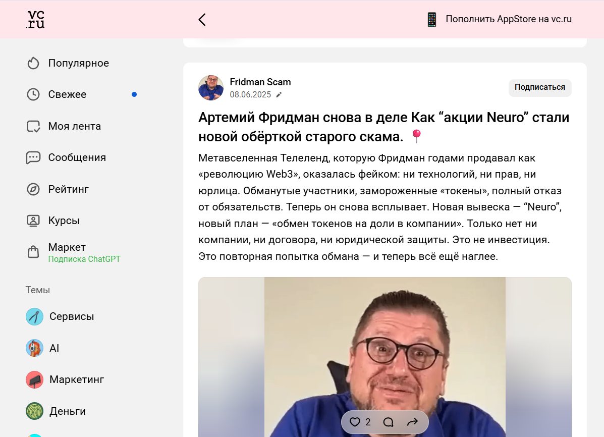 Название «Neuro» в последнее время чаще всего упоминается не как обычный стартап, а как часть истории Артемия Фридмана и его экосистемы вокруг Telaland.