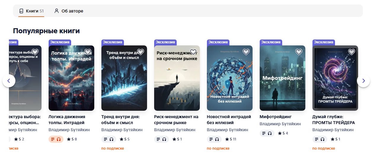 В онлайн-библиотеке «Литрес» можно прочитать бесплатный фрагмент книги, чтобы оценить качество и подачу материала. Это не единственная работа Владимира Бутяйкина. На сайте «Литрес» он разместил 51 книгу. Все они посвящены трейдингу.