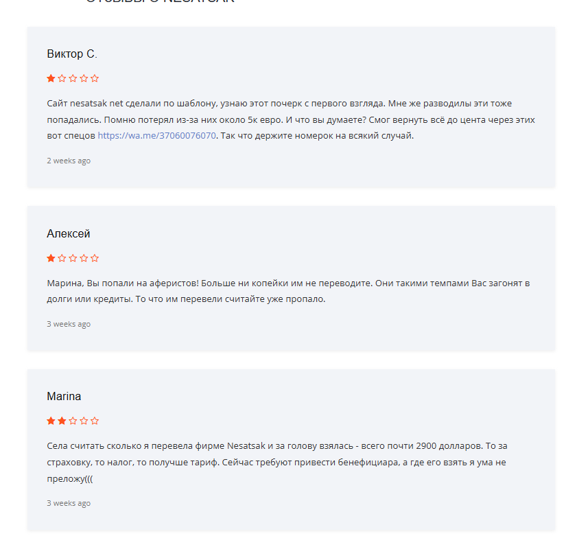О сайте https nesatsak net отзывы в сети только негативные. Пользователи рассказывают, что встречали в сети множество похожих площадок, все они сделаны одинаково, имеют только разные названия. Также те, кто все-таки решил поработать с брокером, сообщают, что потеряли средства и не смогли ничего вывести с платформы. По мнению большинства, брокер – очередной мошенник, который использует фальшивую платформу для выманивания денег.