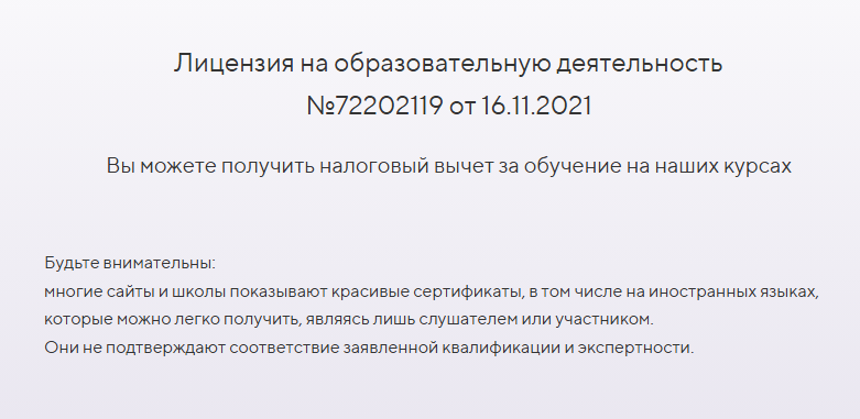 Юридически проект оформлен через ООО Завтра и сейчас, заявлена лицензия на образовательную деятельность №72202119. Это повышает формальный уровень доверия по сравнению с неоформленными инфопродуктами.