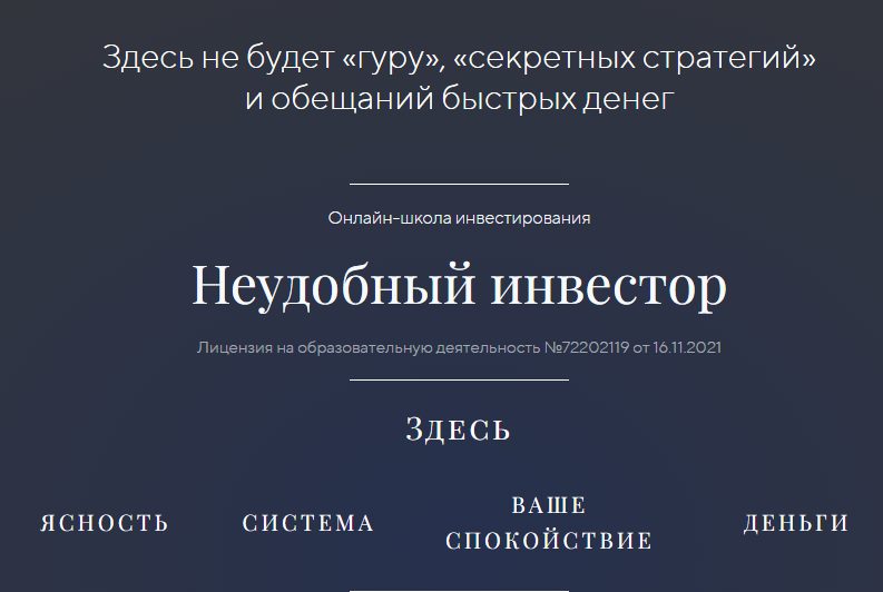 Проект Неудобный Инвестор отзывы от учеников еще не получил. Это онлайн-школа финансовой грамотности и инвестирования Натальи Смирновой. Девушка обещает на курсе научить клиентов формированию базовых и продвинутых навыков управления капиталом. На платформе есть обучающие программы, интенсивы и доступ в закрытое сообщество с разбором инвестиционных решений. При этом квалификация самой Смирновой в интернете никак не подтверждена.