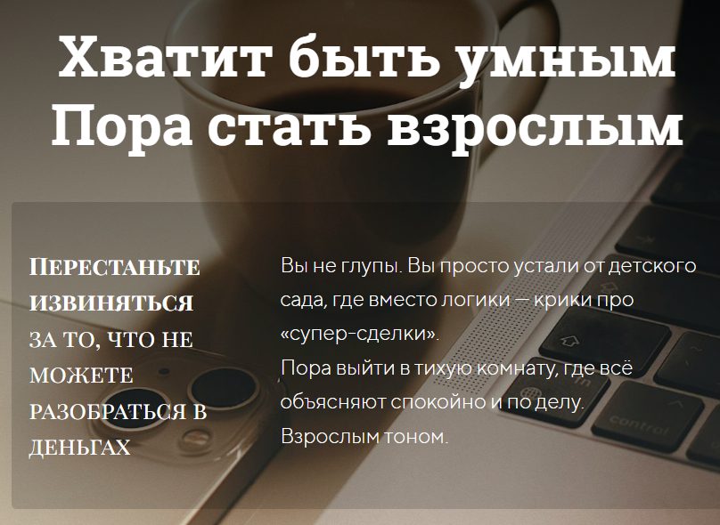 Обучение строится вокруг концепции системного подхода к финансам. Основной акцент делается не на агрессивной доходности, а на сохранении капитала. Несколько блоков посвящены контролю рисков и формированию долгосрочной финансовой стратегии.