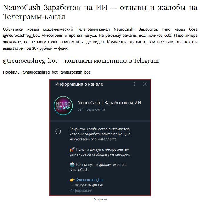 В описании телеграмм-канала были указаны контакты бота для заработка, его можно было найти по внутренней ссылке @neurocash_bot или @neurocashreg_bot. Один из чатов удален полностью, возможно, из-за жалоб, а второй не реагирует на запросы, поэтому запустить его и узнать об услугах не получится.