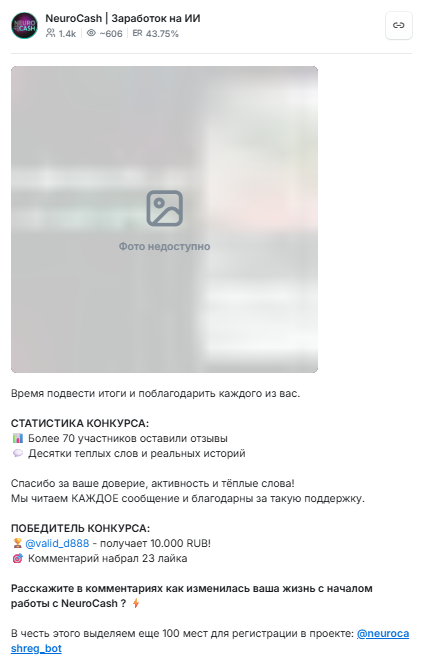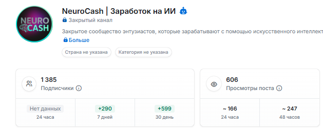 Телеграмм-канал «NeuroCash | Заработок на ИИ» появился в ноябре 2025 года, на него подписано 1 385 человек, что сложно связать с накруткой. В описании ресурса сказано, что сообщество создано энтузиастами, зарабатывающими на искусственном интеллекте, больше никакой информации не представлено.
