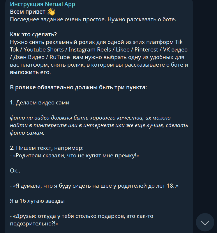 Набрав нужное количество, можно поставить звезды на вывод. Для этого нужно дополнительно указать свой ник в соцсети, который боту и так уже известен. Появится сообщение, что нужно подождать 24 часа для одобрения заявки. Как правило, ждать долго не приходится. Приходит уведомление о том, что нужно выполнить еще одно задание. На этот раз уже точно-точно последнее, но если хоть один пункт из него не будет реализован, то оплата не пройдет. Нужно записать ролик о данном приложении и выложить его в своих социальных сетях. Требуется на видео рассказать, что бот в Телеграме Neutgbot не скам, он безопасный и всем платит, поэтому удалось собрать много звезд.