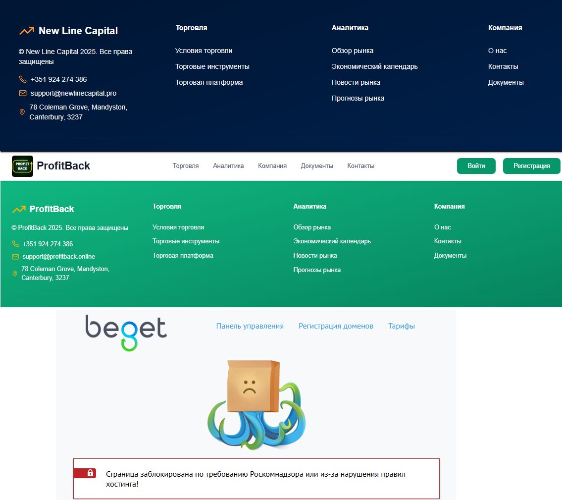 Помимо того, что дата запуска сайта в январе 2026 не совпадает с утверждением о пяти годах работы, в работе сервиса обнаружены и другие несоответствия. Указанный адрес 78 Coleman Grove, Mandyston, Canterbury, 3237 ранее уже использовался аналогичными брокерскими платформами, как и другие контактные данные, включая телефон. Например, сайт profitbackapp com, который на данный момент заблокирован по требованию Роскомнадзора.
