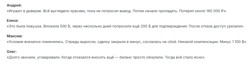 На момент проверки NewLine Capital отзывы о брокере и его торговом терминале trade newlinecapital pro только стали появляться. В них описан типичный сценарий: пополнение счёта — демонстрация прибыли — отказ в выводе — требования дополнительных платежей — блокировка.