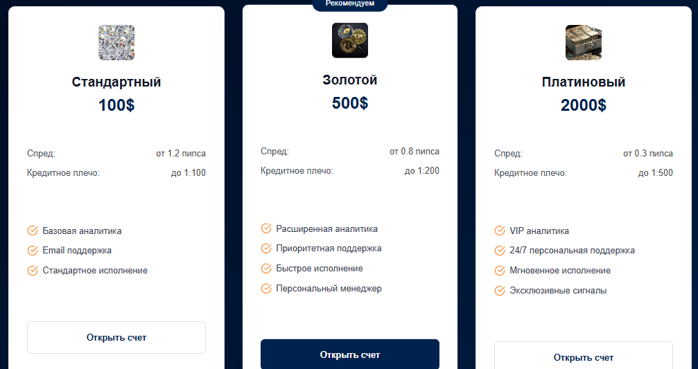 - Платиновый — депозит от 2.000$, плечо до 1:500, VIP-аналитика и эксклюзивные сигналы.