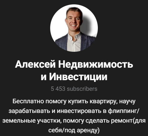 На канале Алексей Недвижимость и Инвестиции 5400 подписчиков. Его владелец является публичным персонажем, не прячет лицо, может представляться реальным именем.