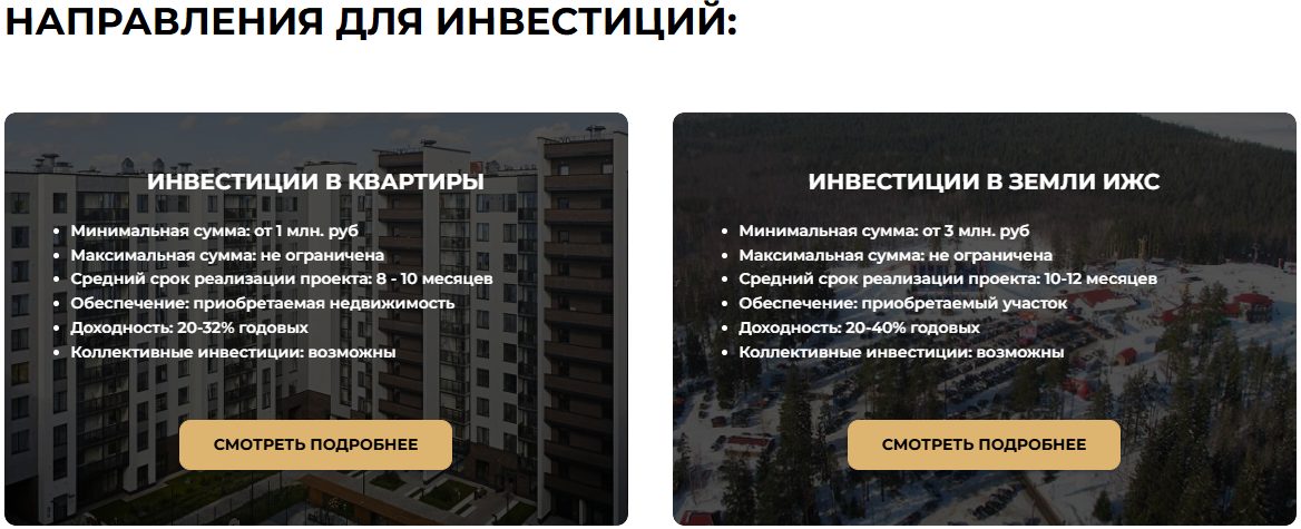Минимальная сумма для инвестиций в квартиру при сотрудничестве с Алексеем составляет 1 млн рублей, а для вложений в землю — 3 миллиона. Доходность обещает до 40% годовых.
