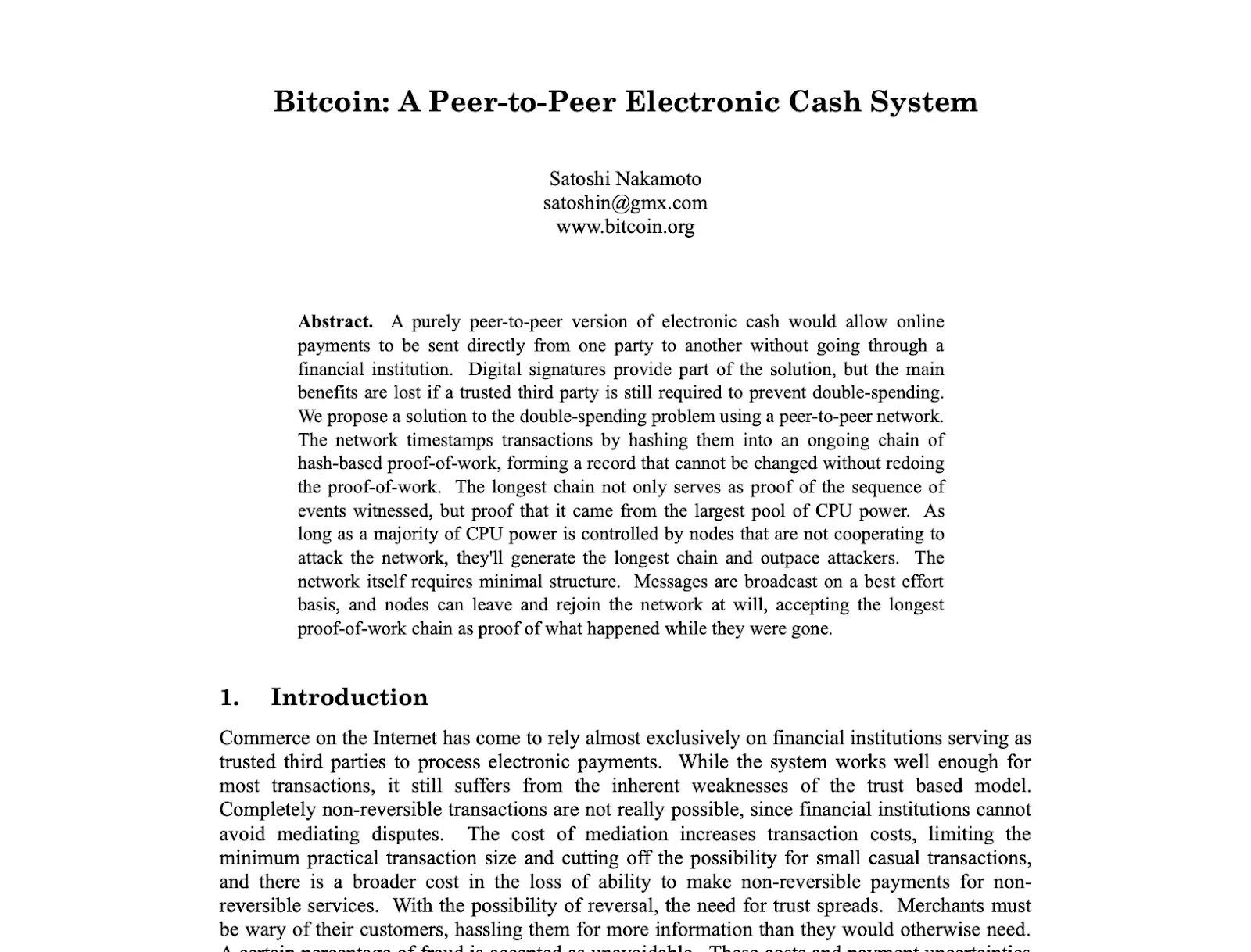 Титульная часть white paper «Bitcoin: A Peer‑to‑Peer Electronic Cash System»
