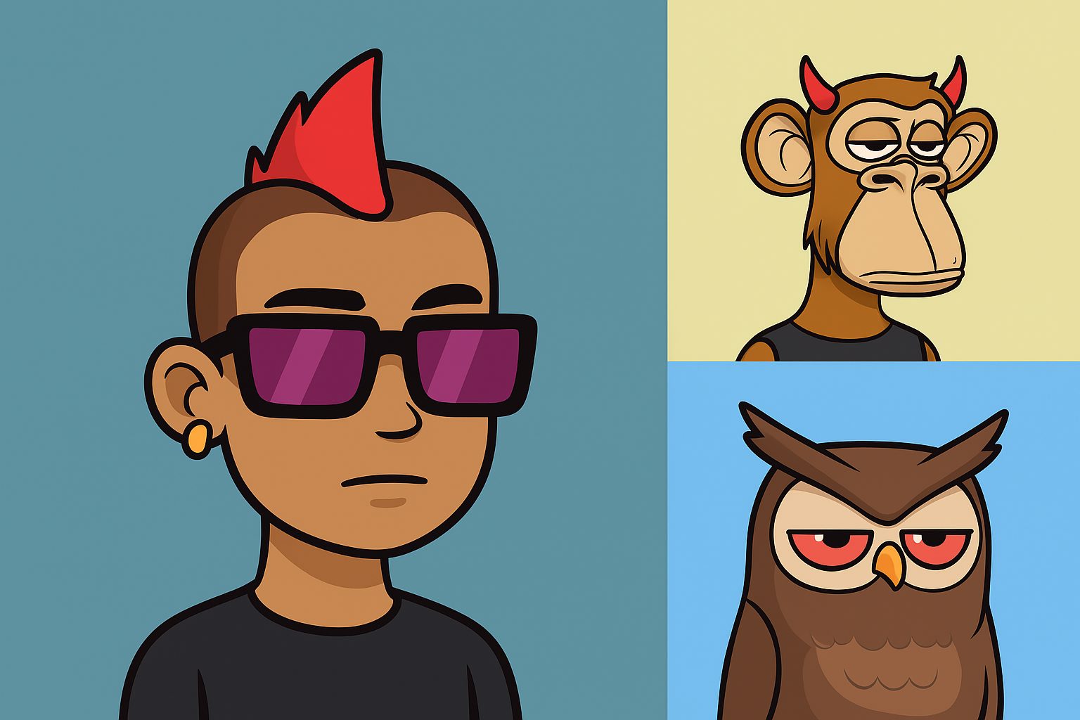 Если упростить, речь о 2D-арте, чаще всего о статичном портрете, который торгуется как NFT на маркетплейсах. Обычно это кадр по плечи: животные, люди или антропоморфные персонажи — идеальный формат для профилей в соцсетях и сообществ.