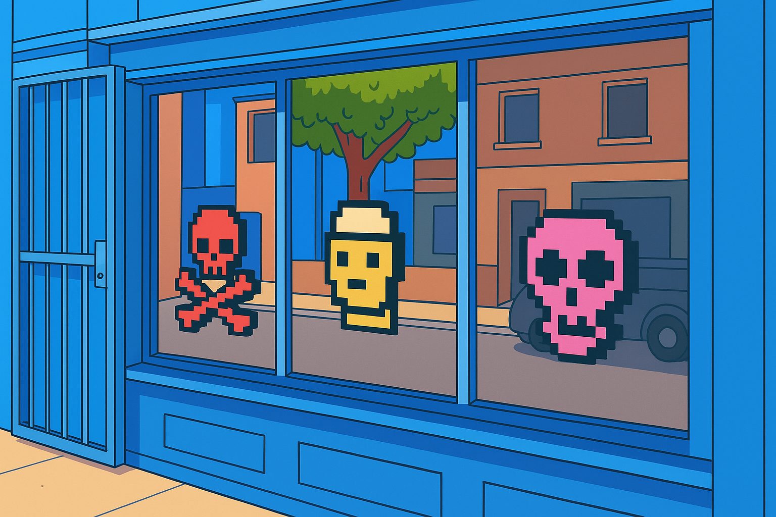 Возле галереи Psyborg в лондонском Шордиче экспонируются работы из серий CryptoPunk и CryptoSkull; посещение доступно по предварительной записи.