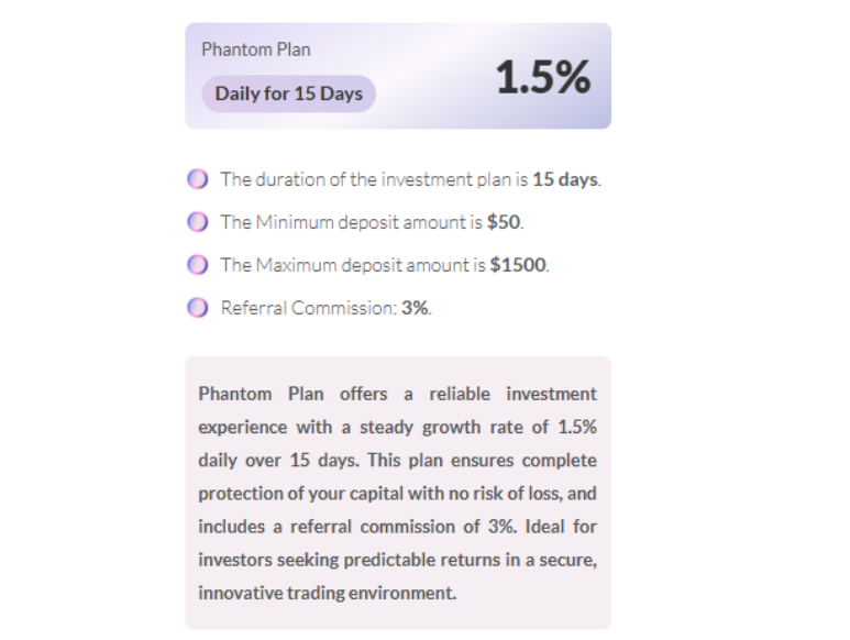 Основная функция проекта — посуточная доходность. Брокер предлагает специальные тарифные планы для пассивного заработка. После пополнения депозита пользователь может выбрать пакет для дальнейшей прибыли. Мы нашли один из тарифов — Phantom Plan. Вход от 50 долларов и до 1500 со ставкой от 1.5% в сутки. Дополнительно есть реферальное вознаграждение в 3%.