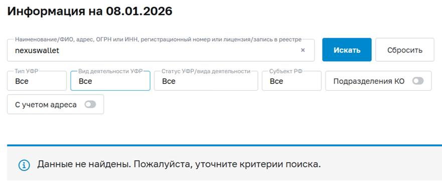 У кошелька Nexus анонимная деятельность, поскольку ничего неизвестно о разработчиках и команде сервиса. Не сообщается о лимитах и комиссиях на площадке. Мы не нашли подтверждение легальной деятельности, поскольку у финансового сервиса отсутствует официальная лицензия Центрального Банка РФ.