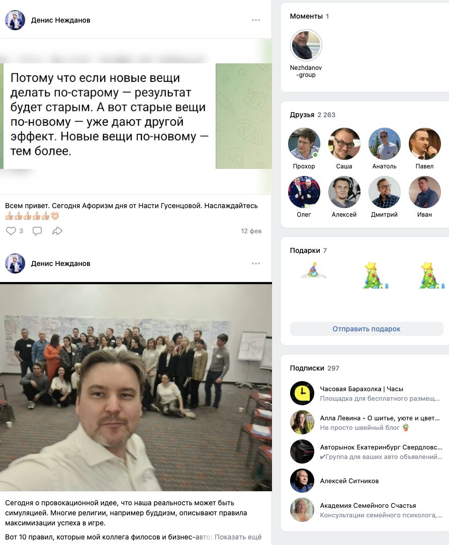 У страницы Дениса Нежданова во «ВКонтакте», которая располагается по адресу nezdanov1980, на 6 марта 2026-го года более 2,2 тысяч друзей. Публикации в ленту этого аккаунта коуч выкладывает с регулярность 3-5 раз в месяц. Они заслуживают по 2-7 лайков.