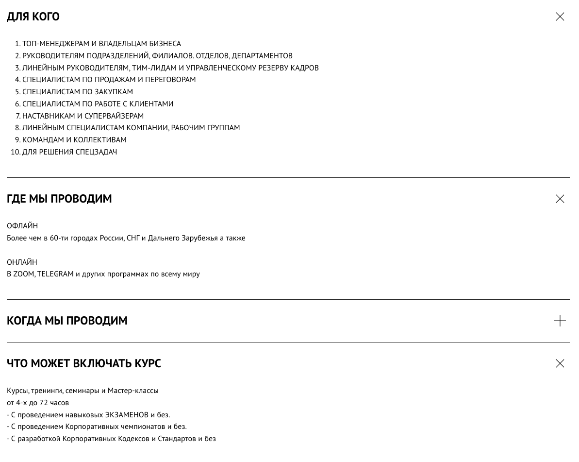Подробное описание тренингов не представлено. Также на сайте академии ничего не сказано о стоимости участия в проводимых мероприятиях. Чтобы узнать цену, условия, а также подробную информацию о тренингах, нужно оставить заявку на сайте коуча.