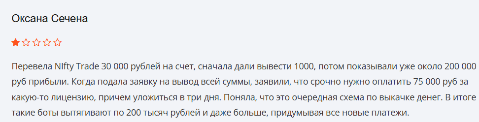 Пользователи оставляют негативные отзывы о Nifty Trade. Один из них пишет, что скамеры сначала позволяли ему выводить небольшие суммы. Однако при попытке снять 200 тыс. руб. он столкнулся с требованием «заплатить за лицензию» 75 тыс. руб. В итоге получить обратно свои средства не удалось.