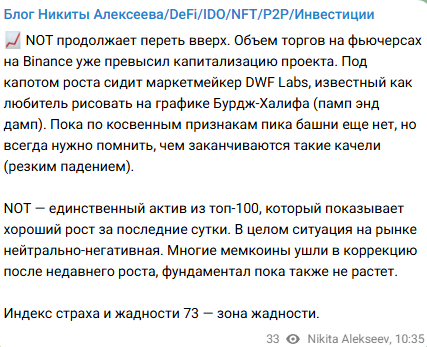 Еще одна публикация блога Никиты Алексеева DeFi IDO NFT P2P про инвестиции рассказывала о продолжающемся росте криптовалюты NOT, а также об индексе страха и жадности. Данная информация не является уникальной, блогер взял ее в сторонних источниках.