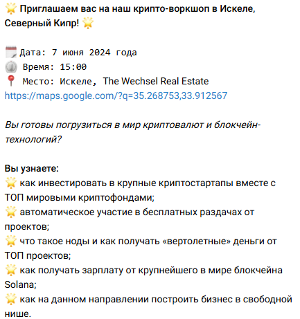 В одном из постов автор канала Neki4 Invest призывал аудиторию участвовать в офлайн-мероприятии на Кипре. Такой контент является рекламным и несет мало пользы для читателей.