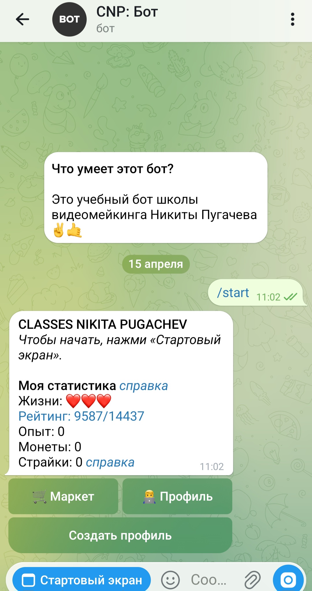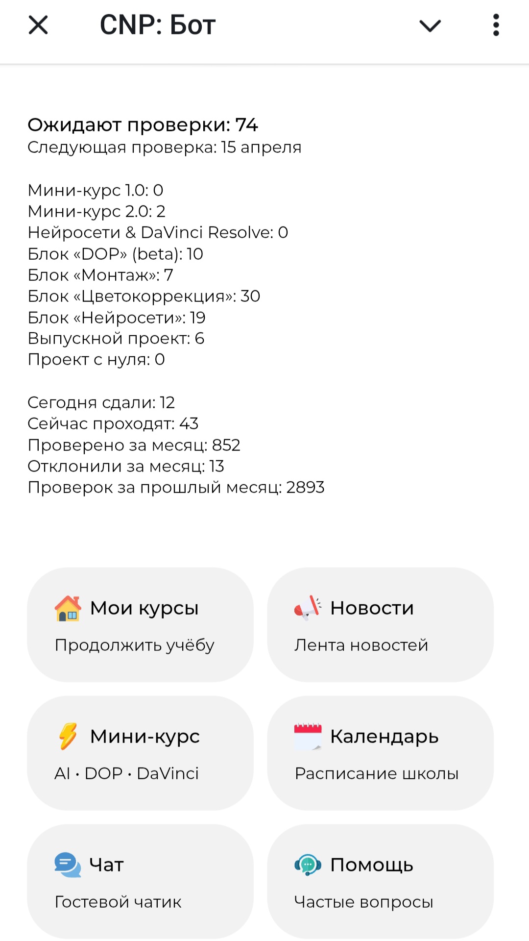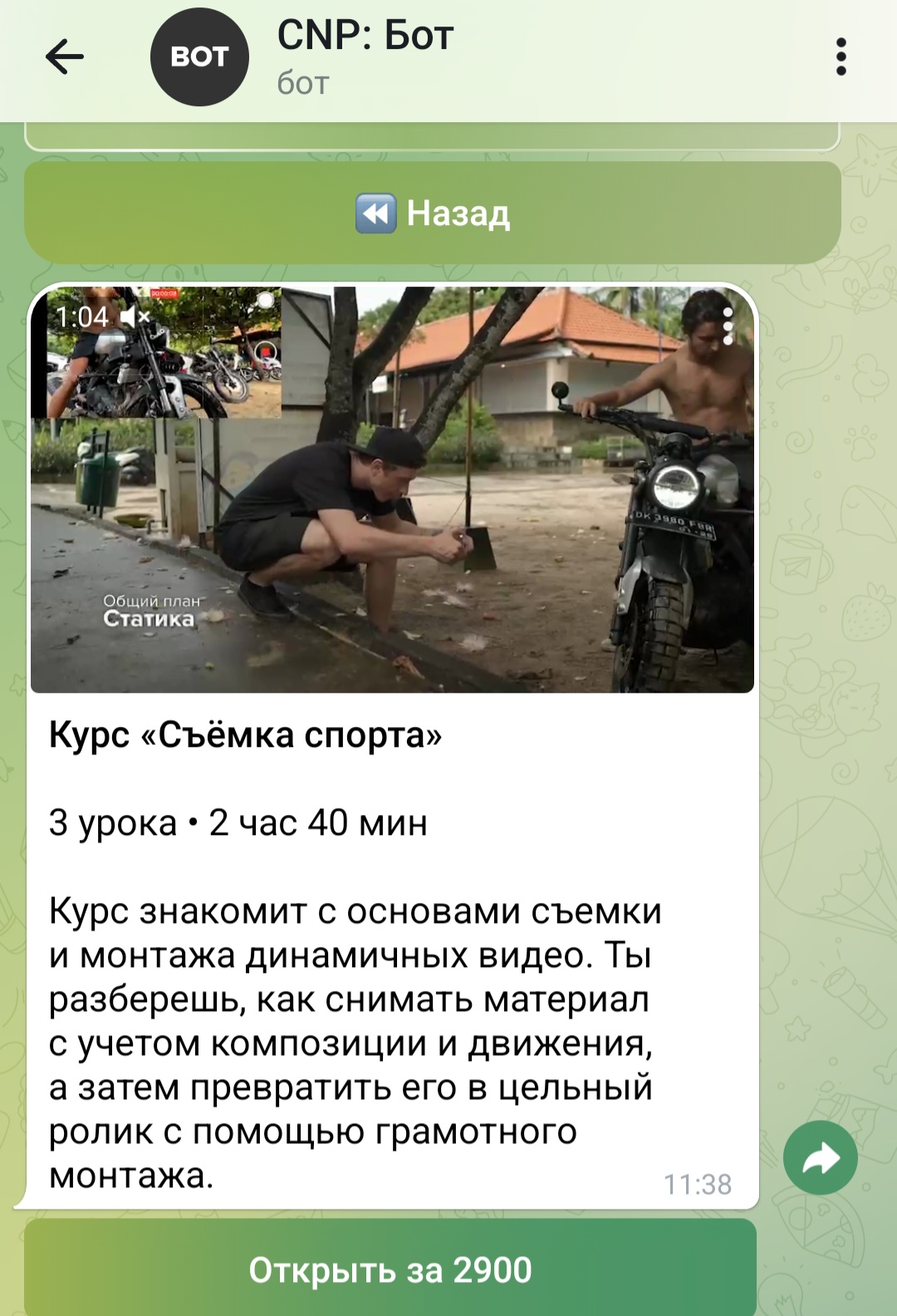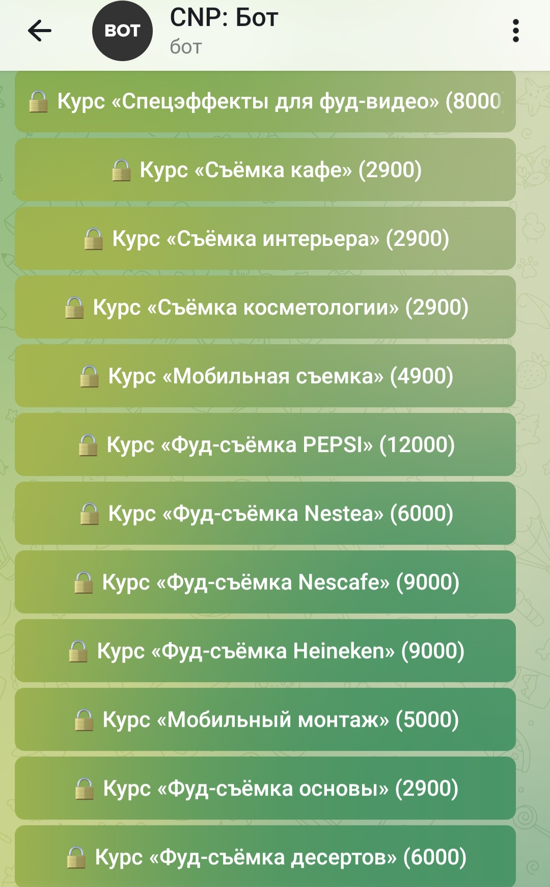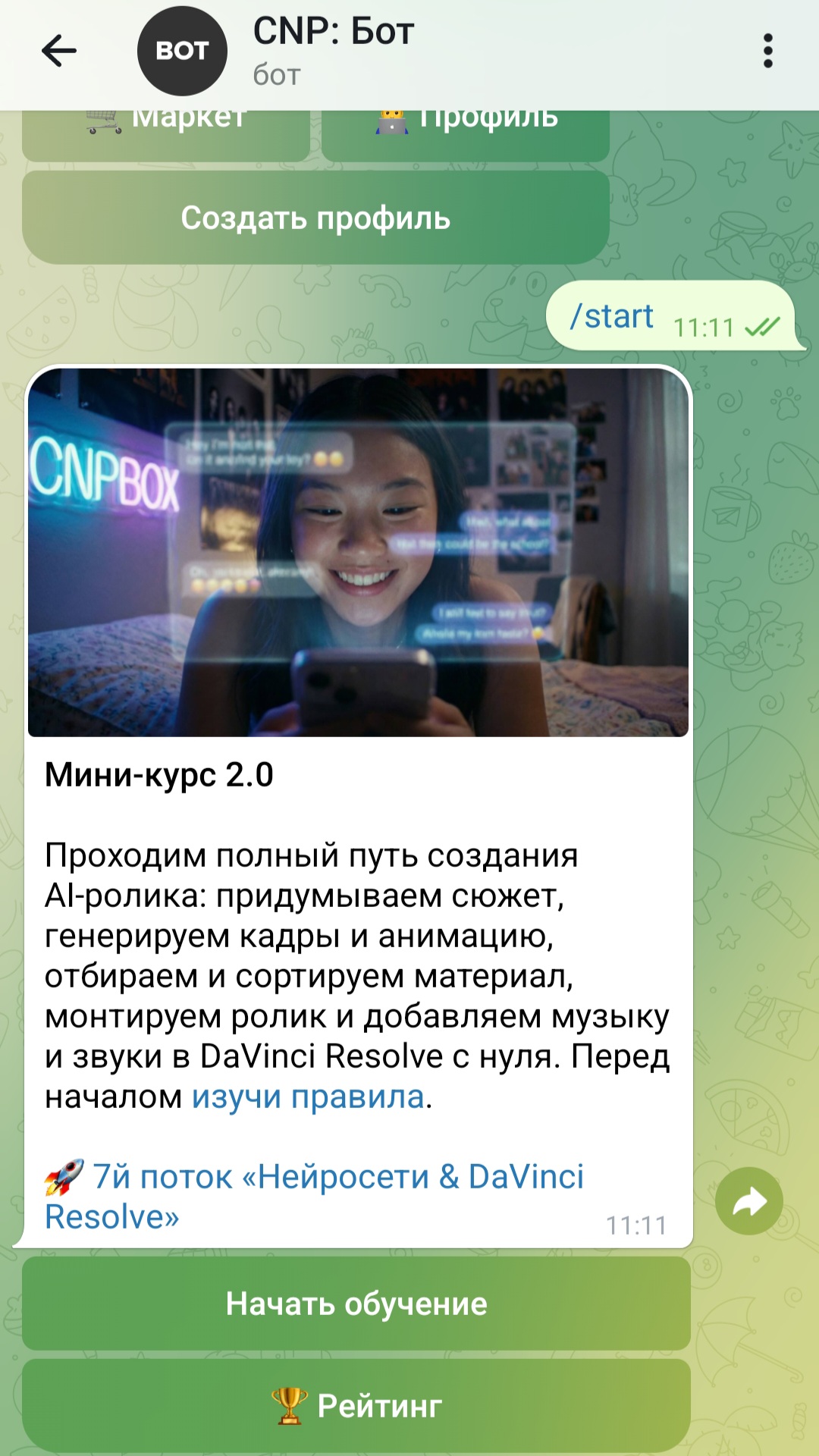 Пугачев оказывает образовательные услуги исключительно через телеграмм-бота cnp box. Представляет его как учебный бот школы видеомейкинга. Через него предлагает пройти курс “Нейросети & DaVinci Resolve”. В бесплатном доступе находится лишь его сокращенная версия.