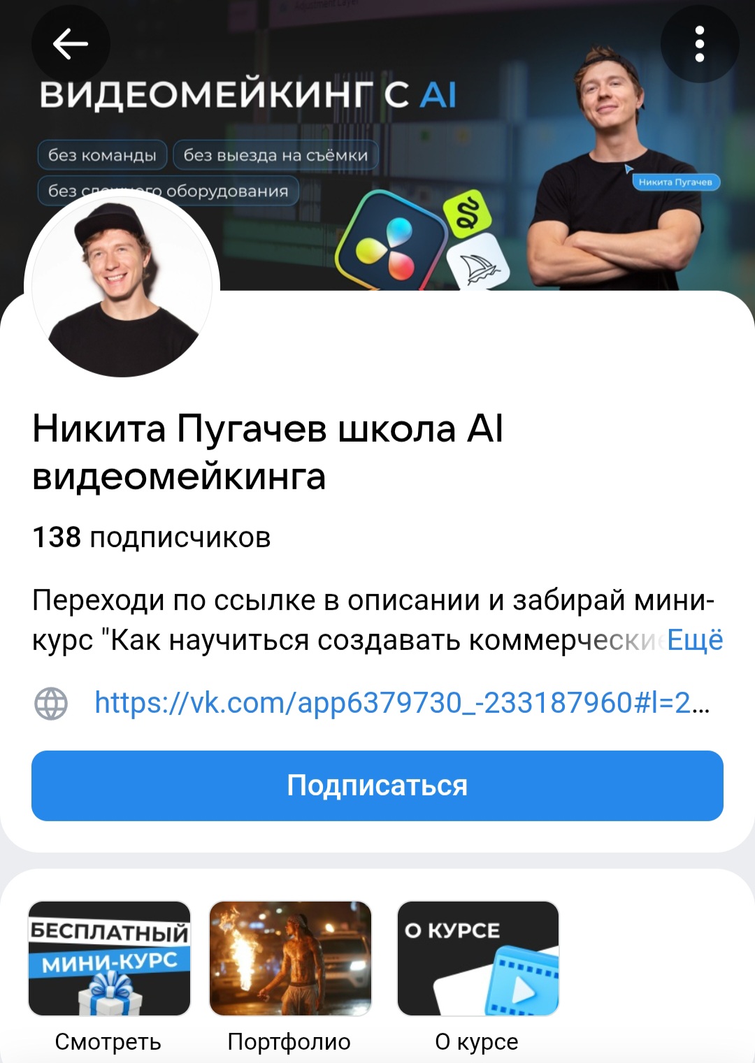 Ведет Пугачев и страницу во Вконтакте. Она называется “Видеомейкинг с AI”. Она имеет 138 подписчиков. На странице Никита дает ссылку на курс и бота. Аудитория проявляет низкую активность.
