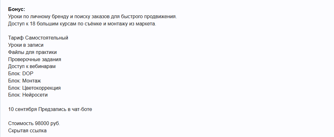 Полный курс Никиты “Нейросети & DaVinci Resolve” является платным. До прохождения бесплатных уроков его стоимость Пугачев не раскрывает. Но по данным открытых источников цена базового тарифа достигает 98000 рублей. В нее включен доступ к 18 большим курсам по видеосъемке и монтажу, вебинарам, практическим материалам.