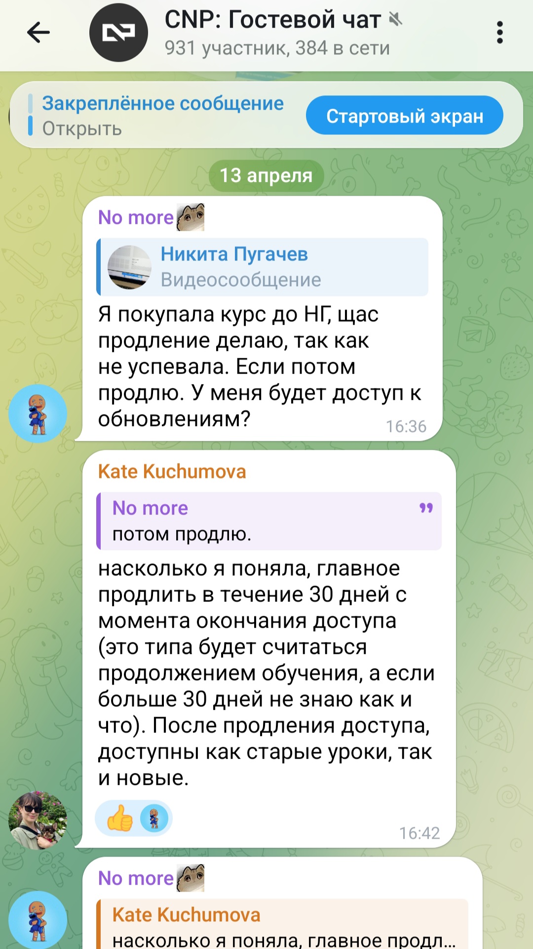 Помимо телеграмм-бота у Пугачева есть чат в мессенджере, в котором ученики могут общаться между собой. Называется он “CNP: Гостевой чат”. По состоянию на 15 апреля 2026 год, в нем состоит 931 человек. Из них активность проявляет только третья часть.