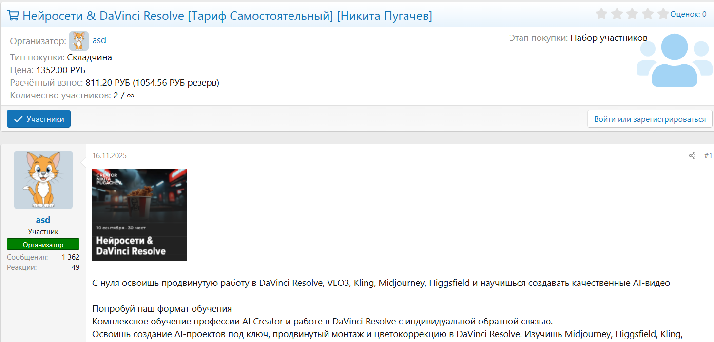 На сторонних сайтах цена тарифного плана “Самостоятельный” курса “Нейросети & DaVinci Resolve” составляет 1352 рублей. Есть возможность приобретения материалов в складчину с минимальным входом 811 рублей. Это может указывать на низкую оценку курса его выпускниками.