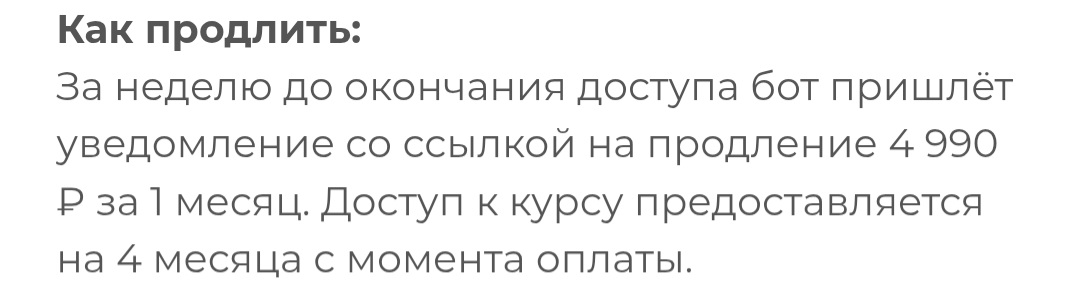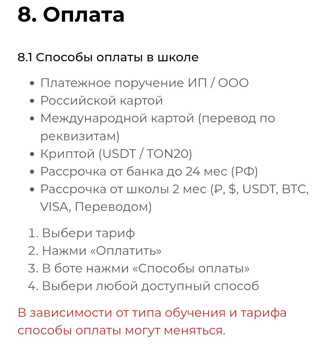 Оплата принимается на банковскую карту в долларах, рублях или криптовалюте. Возможна рассрочка на 24 месяца. Доступ к материалам после приема денег открывается на 4 месяца. Его продление платное и стоит 4990 рублей в месяц. В него включено обновление учебного материала.