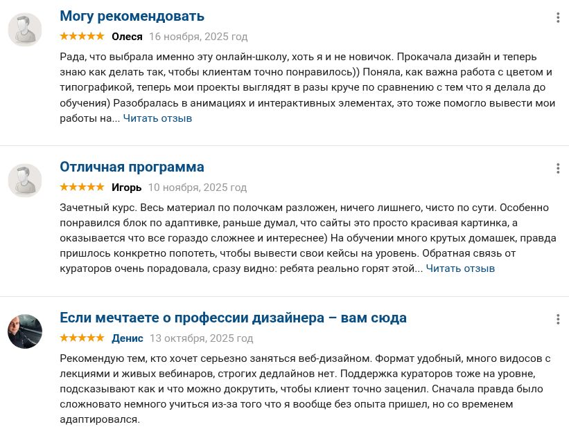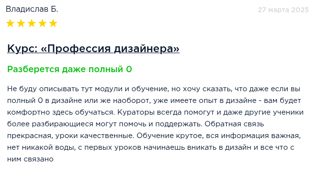 На площадках с отзывами о курсах у школы большинство откликов положительные, с уровнем доверия «высокий». Студенты в основном пишут про бесплатный вводный курс — он конвертирует хорошо. Отмечают активность кураторов, большое количество практических заданий и то, что первые реальные заказы удавалось брать еще в процессе обучения.