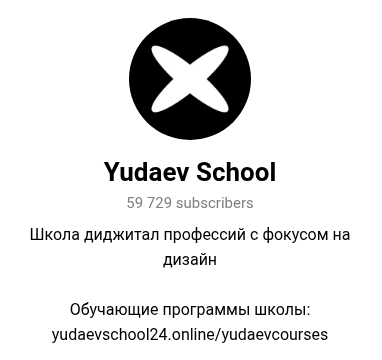 Телеграм-канал Yudaev School работает по ссылке @yudaevdesign и имеет почти 60 000 подписчиков. Для образовательного проекта в нише дизайна это живая и заметная аудитория.