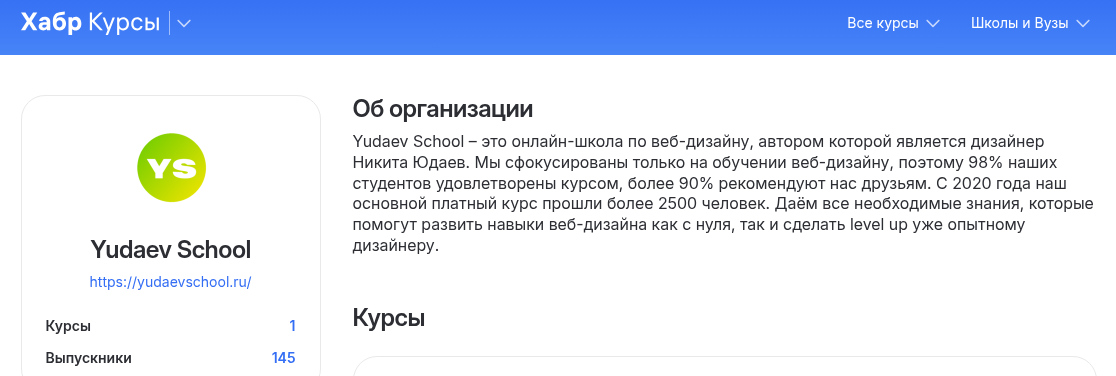 Yudaev School присутствует на агрегаторах Хабр Курсы и Mooc — там у школы есть страницы с описанием курсов. Небольшой, но показательный плюс — школы-однодневки на таких платформах, как правило, не регистрируются.
