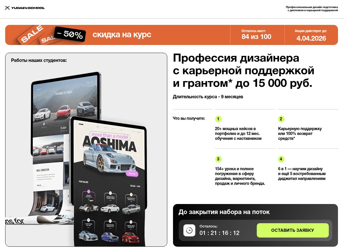 Yudaev School — один из немногих образовательных проектов в нише дизайна с реальной историей и подтвержденной аудиторией, а не просто красивой страницей с таймером обратного отсчета.