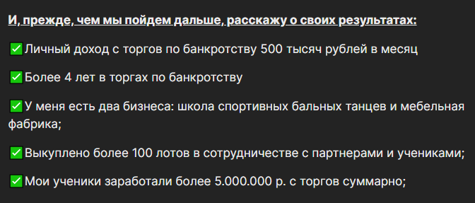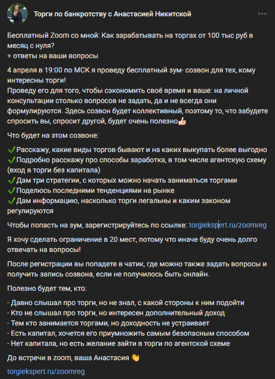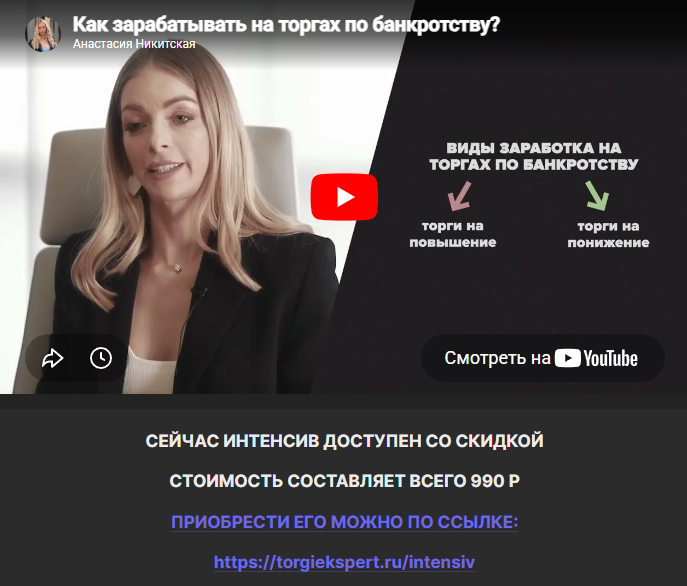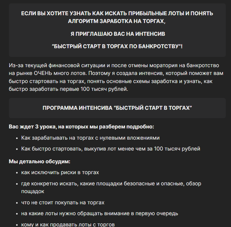 Студентам Анастасия Никитская предлагала интенсив под названием «Быстрый старт в торгах по банкротству». Программа состояла из трех уроков с разбивкой по разным темам: подбор лотов, механизм выкупа, особенности перепродажи и пр.