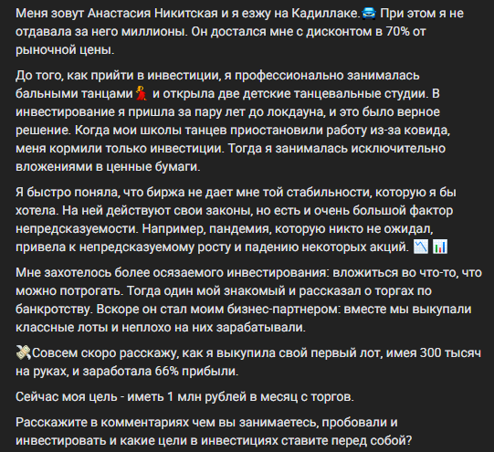 Девушка заявляет о четырехлетнем опыте работы в сфере, доходе в ₽500,000 на перепродаже лотов, при этом также есть отметка о том, что ее ученики якобы суммарно заработали более ₽5,000,000. Достоверность статистики вызывает вопросы, никакой верификации не использовано, а значит убедиться в реальности сказанных слов невозможно.