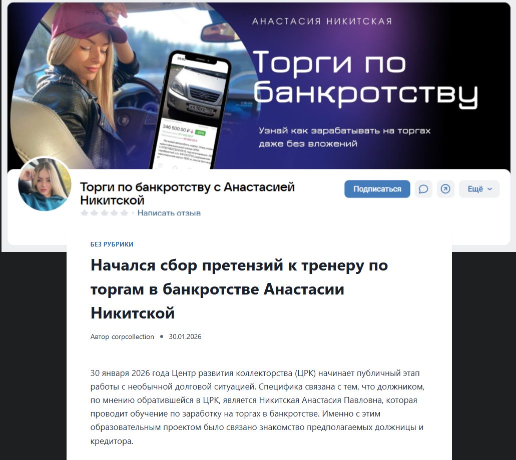 В начале 2026 года в Сети появилась информация о том, что ученики проекта собирают претензии к Анастасии Никитской. Обращения граждан зарегистрировал Центр развития коллекторства и к концу апреля проводит необходимые мероприятия. Наставника вместе с кураторами и консультантами подозревают в завышении стоимости прохождения обучения и мошенничестве.