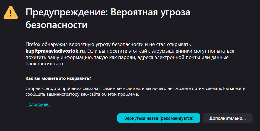 Причем уже через 1-2 месяца работы появились проблемы. Во-первых, теперь при попытке перейти на домен появляется предупреждение о рисках безопасности от браузера. Во-вторых, сам веб-домен вернулся на парковку из-за неуплаты.