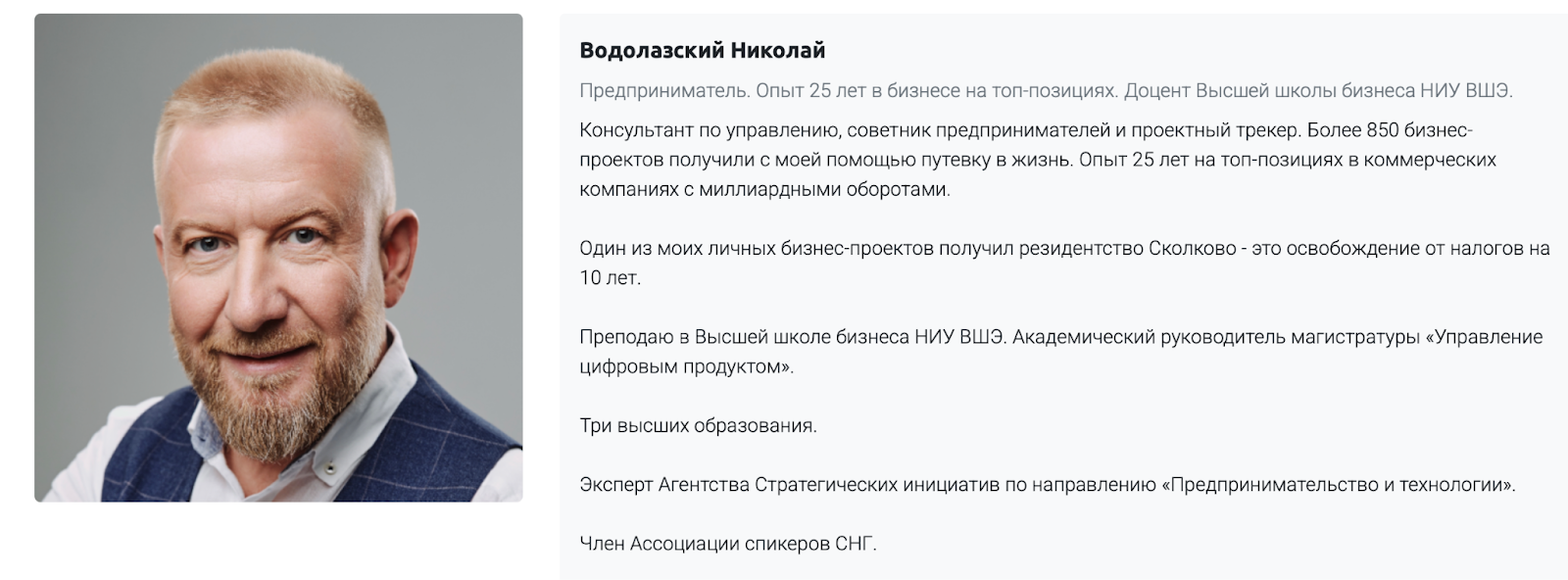 Николай Водолазский — крипта ментор и коуч, который хоть и выглядит солидно, но доверия не внушает. Его красивые обещания и монологи об «успешном успехе» не находят подтверждения в реальной жизни. За заявлениями о сотнях инвестиционных идей и «проверенных стратегиях» не видно живых отзывов с описанием хотя бы одного развернутого кейса.