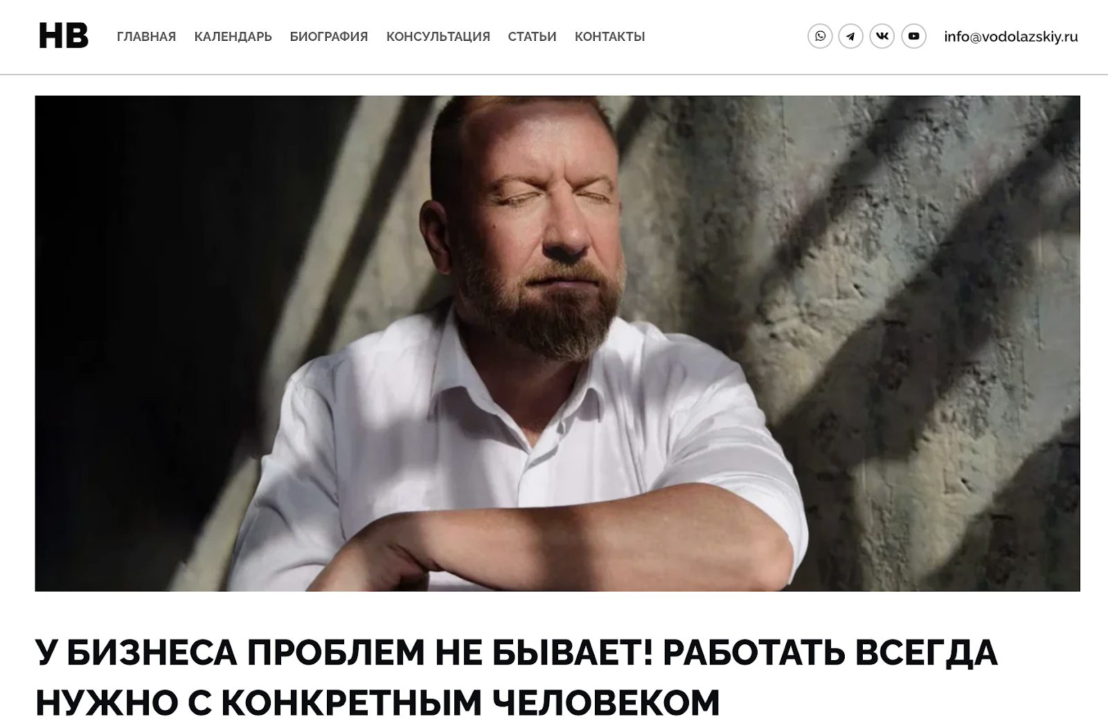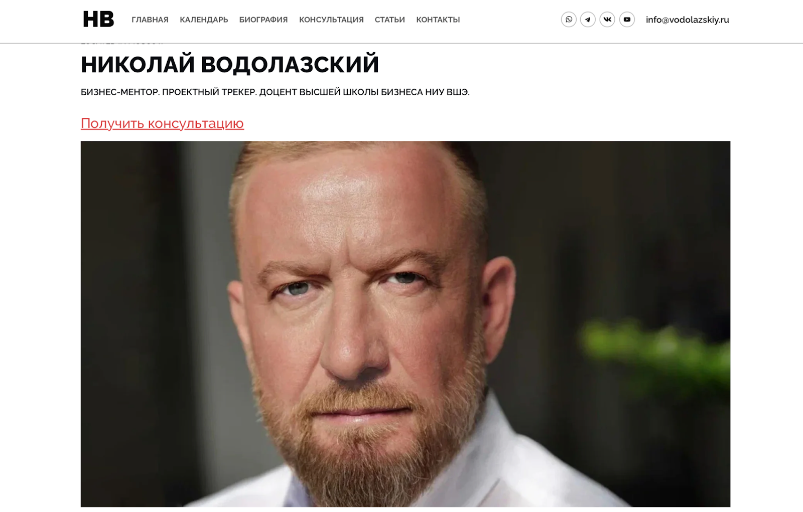 Присутствие в цифровом пространстве у Водолазского достаточно широкое и активное. Начнем с личного сайта, где можно найти краткую биографию, описание курсов, блог с аналитическими заметками и форму для связи. Дизайн строгий, в деловых тонах, что создает ощущение деловитости.