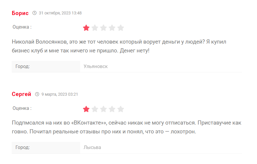 На независимых сайтах пишут, что Николай Волосянков мошенник, ворует деньги. Ранее он предлагал купить доступ в бизнес-клуб, но после получения оплаты пропадал. Те, которые вступили в его группу, не могут отписаться и до сих пор получают навязчивые предложения пройти курс.