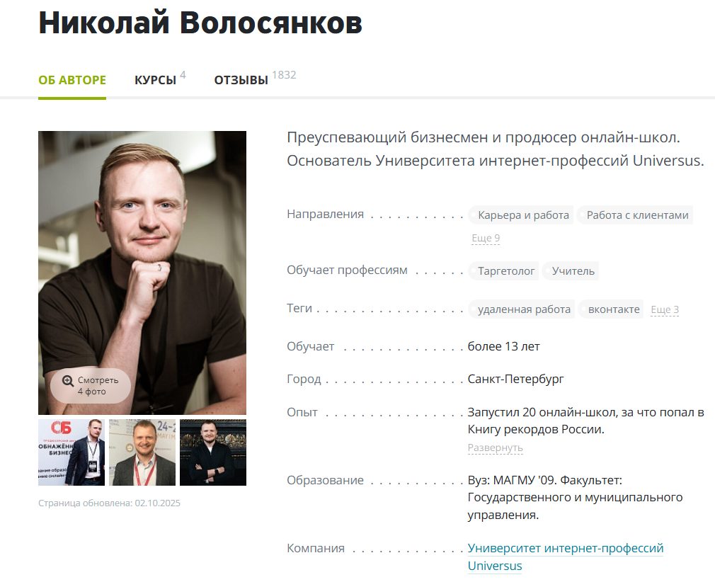 Николай Волосянков — бизнесмен, автор курсов и основатель школы Universus. Предлагает обучить заработку на нейросетях за 49900-179000 рублей. Прежде чем платить такие деньги, следует убедиться, что вы действительно получите полезный материал и он поможет вам выйти на пассивный доход. Для этого мы провели подробный анализ деятельности Волосянкова.