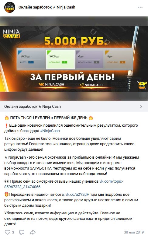 Обзор платформы для заработка Ninja Cash: отзывы о телеграмм-канале NinjaCash и анализ группы «Ниндзя Кэш» во «ВКонтакте»
