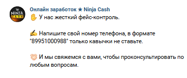 Исходя из этой информации и реальных отзывов о Ninja Cash, возникают подозрения в схеме мошенничества. Утверждается, что создатели группы не получают прибыли с подписчиков, но тогда непонятно, зачем им проводить консультации и стараться.