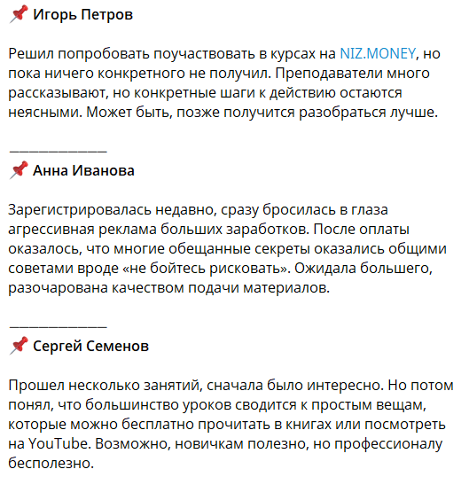 Бывшие ученики считают, что Niz Money – скам. Обучение дорогостоящее, а гарантии получения качественной программы отсутствуют. Самый дешевый тариф обходится 39500 рублей. Это завышенная цена для многих пользователей, которые ищут работу.