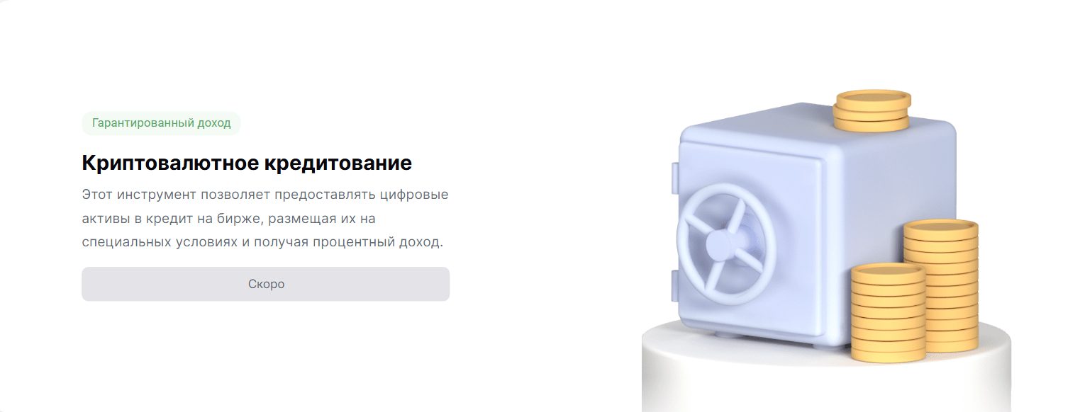 В скором времени создатели биржи планируют запустить криптокредитование. Трейдеры смогут выдавать займы в криптовалюте под процентную ставку 0,3% до 24,85%.